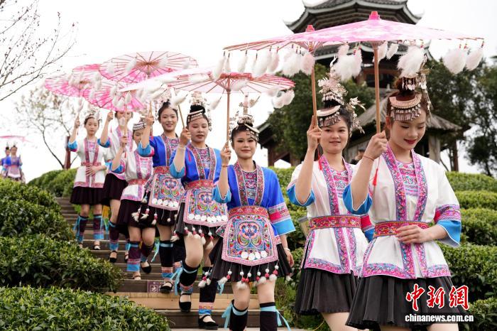图为侗族女士正在茶园走秀。吴练勋 摄